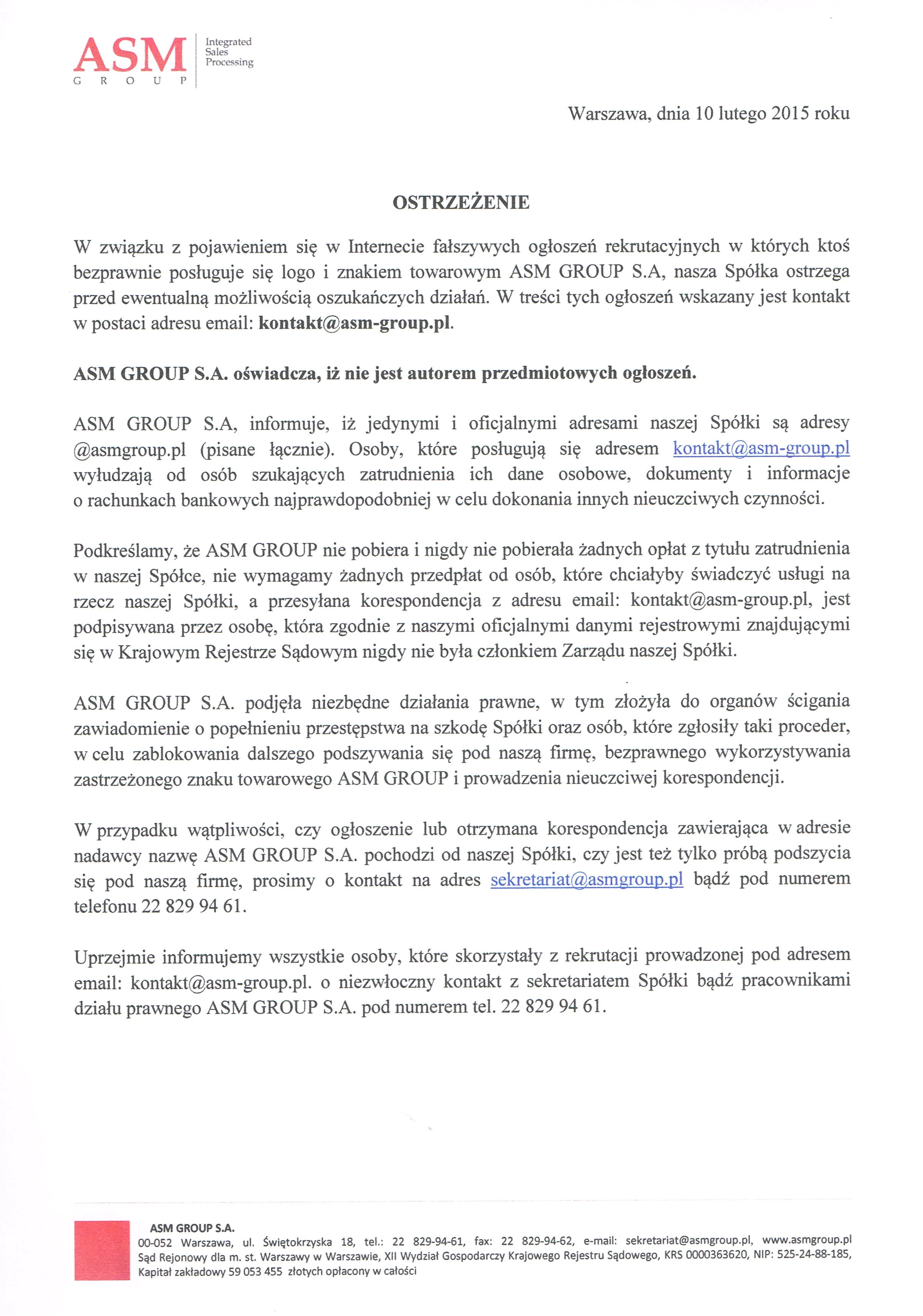 /W internecie pojawia się coraz więcej ogłoszeń o pracę oferowanych przez oszustów podszywających się pod znane marki. Apelujemy o zachowanie szczególnej ostrożności podczas procesu rekrutacji internetowej, gruntowne sprawdzenie firmy do której aplikujemy oraz nie wykonywanie przelewu w celu zweryfikowania przez potencjalnego pracodawcę naszych danych. Pracodawcy powinny wystrczyć podstawowe dane oraz kopie dokumentów poświadczajace wykształcenie lub doświadczenie. Poniżej publikujemy ostrzeżenie wydane przez ASM GROUP, pod którą m.in. podszywają się oszuści.