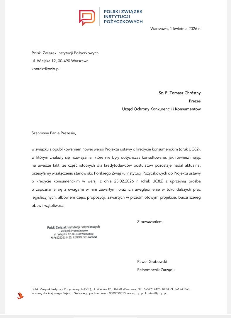 » PZIP przekazał do UOKiK stanowisko ws. nowej wersji projektu ustawy o kredycie konsumenckim