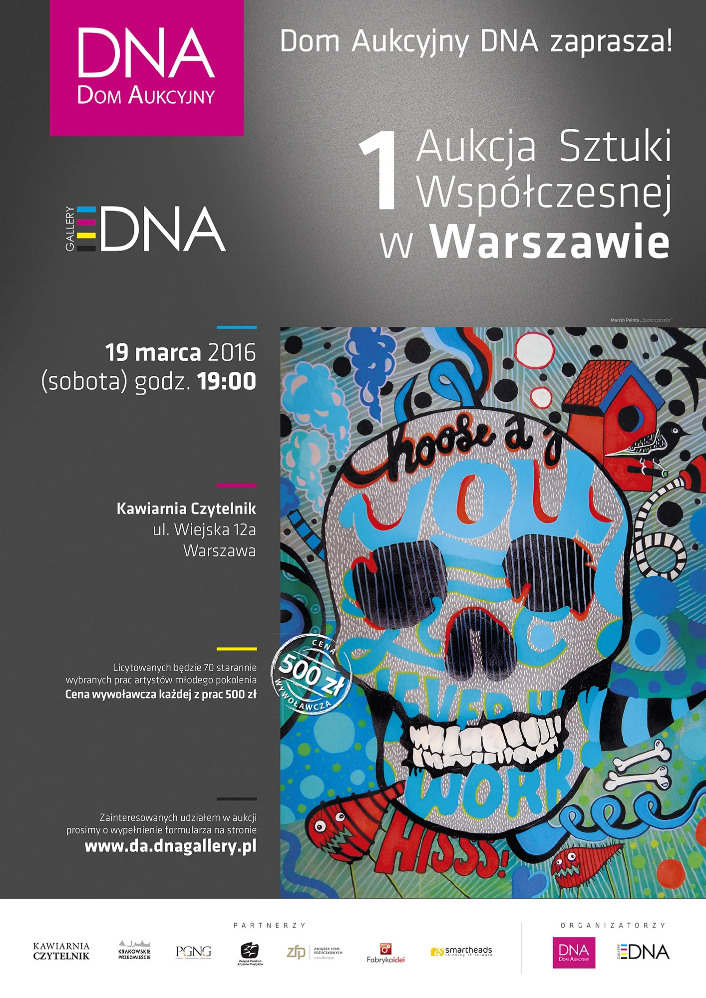 Jako Mecenas Galerii DNA zapraszamy na I Aukcję Sztuki Współczesnej w Warszawie, która odbędzie się w sobotę 19 marca 2016 r. o godz. 19:00 w kawiarni „Czytelnik” przy ul. Wiejskiej 12a. Na aukcji będzie wystawionych 70 obrazów polskich artystów.