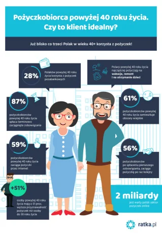 Polacy powyżej 40. roku życia najczęściej pożyczają na: wakacje, remont i na utrzymanie dzieci. Z badania przeprowadzonego przez Ratka.pl wynika również, że 56 proc. pożyczkobiorców po spłaceniu pierwszego zobowiązania, w przyszłości zaciąga pożyczkę po raz kolejny. Wśród klientów w tej grupie wiekowej występuje nieznaczna przewaga mężczyzn, którzy stanowią 51 proc. pożyczkobiorców.