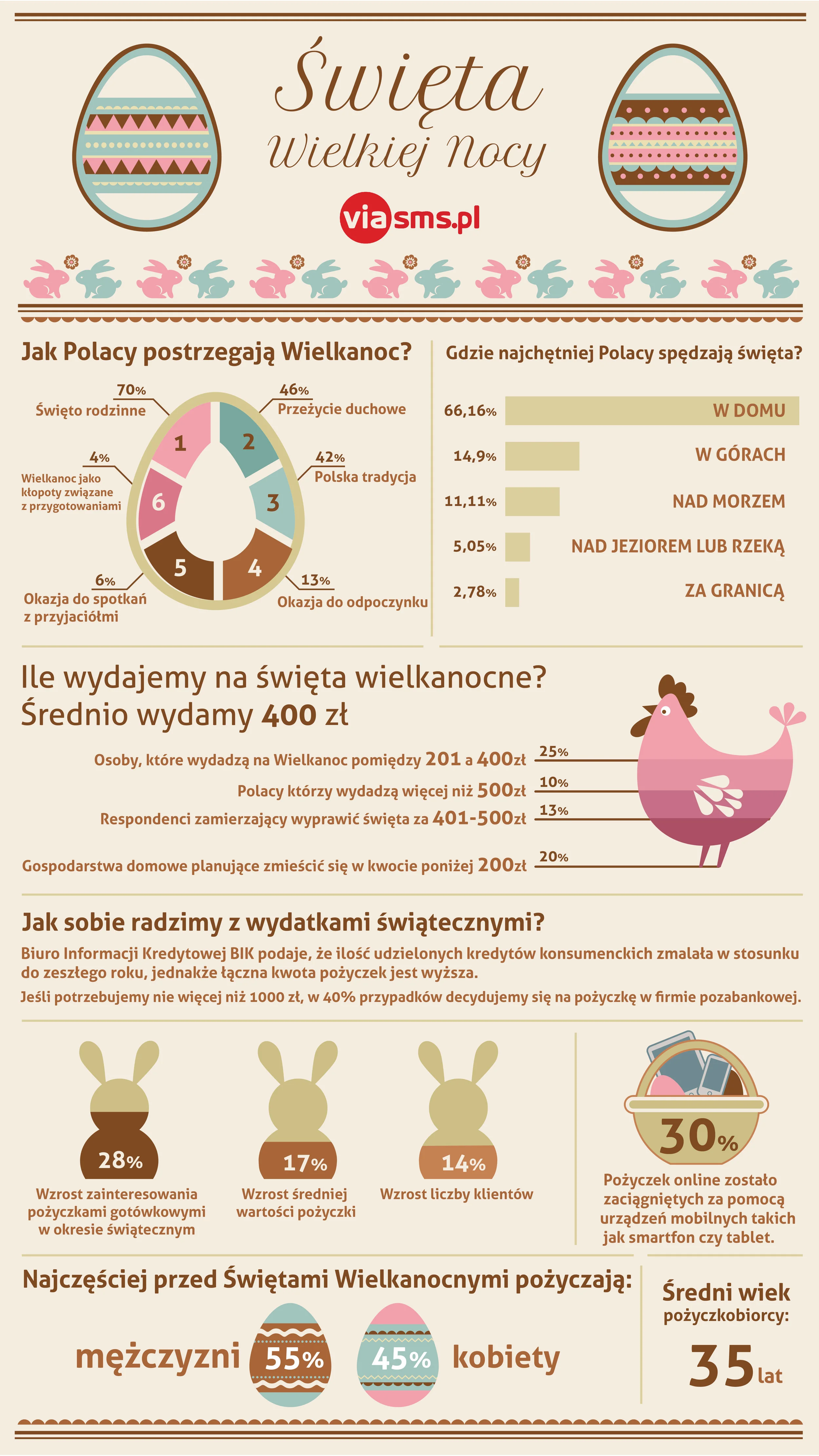 Z przeprowadzonej pośród naszych klientów ankiety wynika, że Wielkanoc jest dla Polaków przede wszystkim świętem rodzinnym oraz przeżyciem duchowym, tylko 13% ankietowanych traktuje je jako możliwość odpoczynku. Pewnie dlatego aż 66 % pożyczkobiorców spędzi święta w domu. Dowiedzieliśmy się także, że Polacy na przygotowanie świąt wydadzą średnio 400 zł.