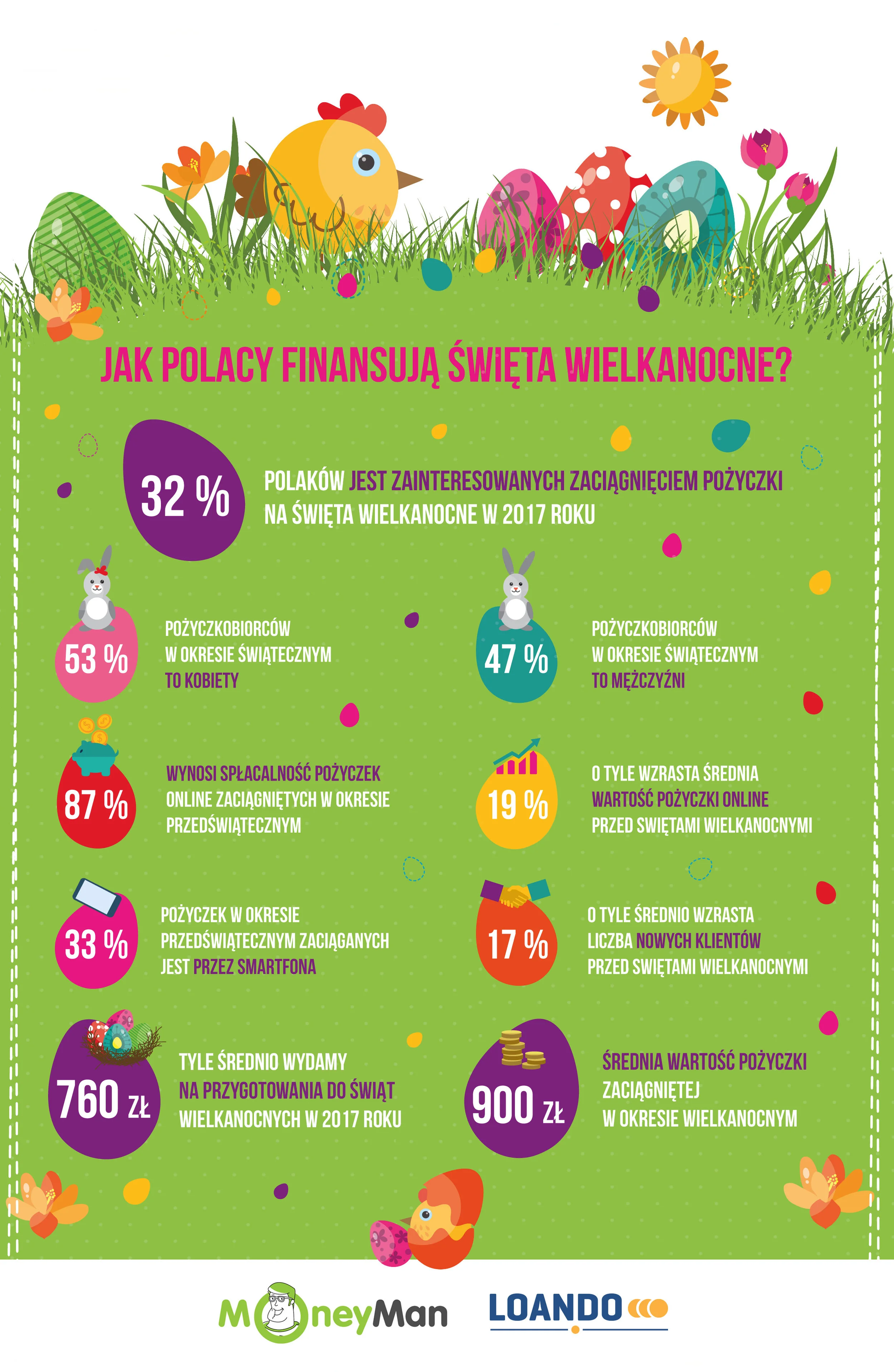 Eksperci szacują, że średnia wartość pożyczki zaciąganej na święta wielkanocne wynosi około 900zł, a jej wartość wzrasta w tym okresie o około 19 proc. Warto również podkreślić, że spłacalność pożyczek online zaciągniętych na Wielkanoc wynosi około 87 proc., co świadczy o rzetelności i sumienności polskich pożyczkobiorców.